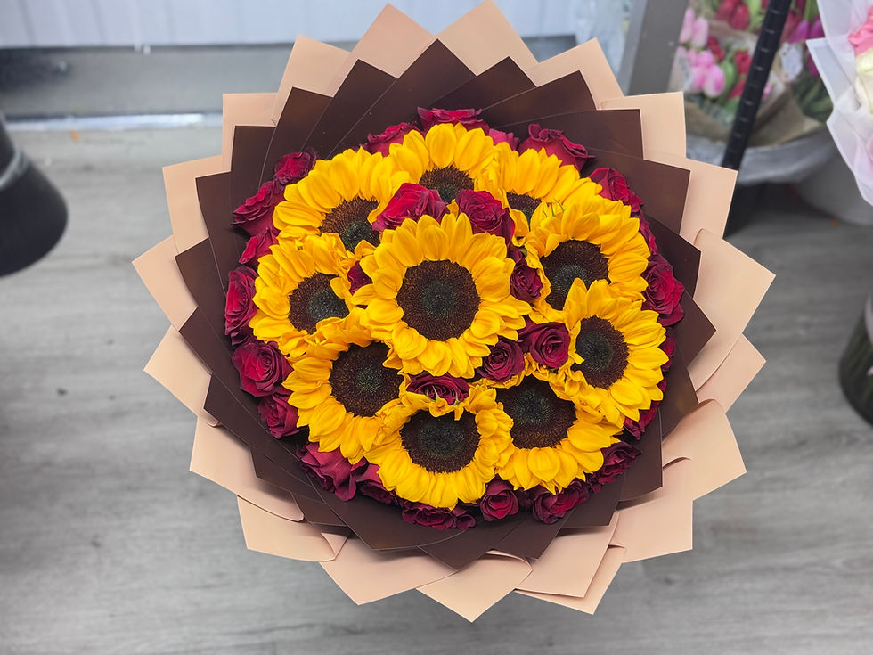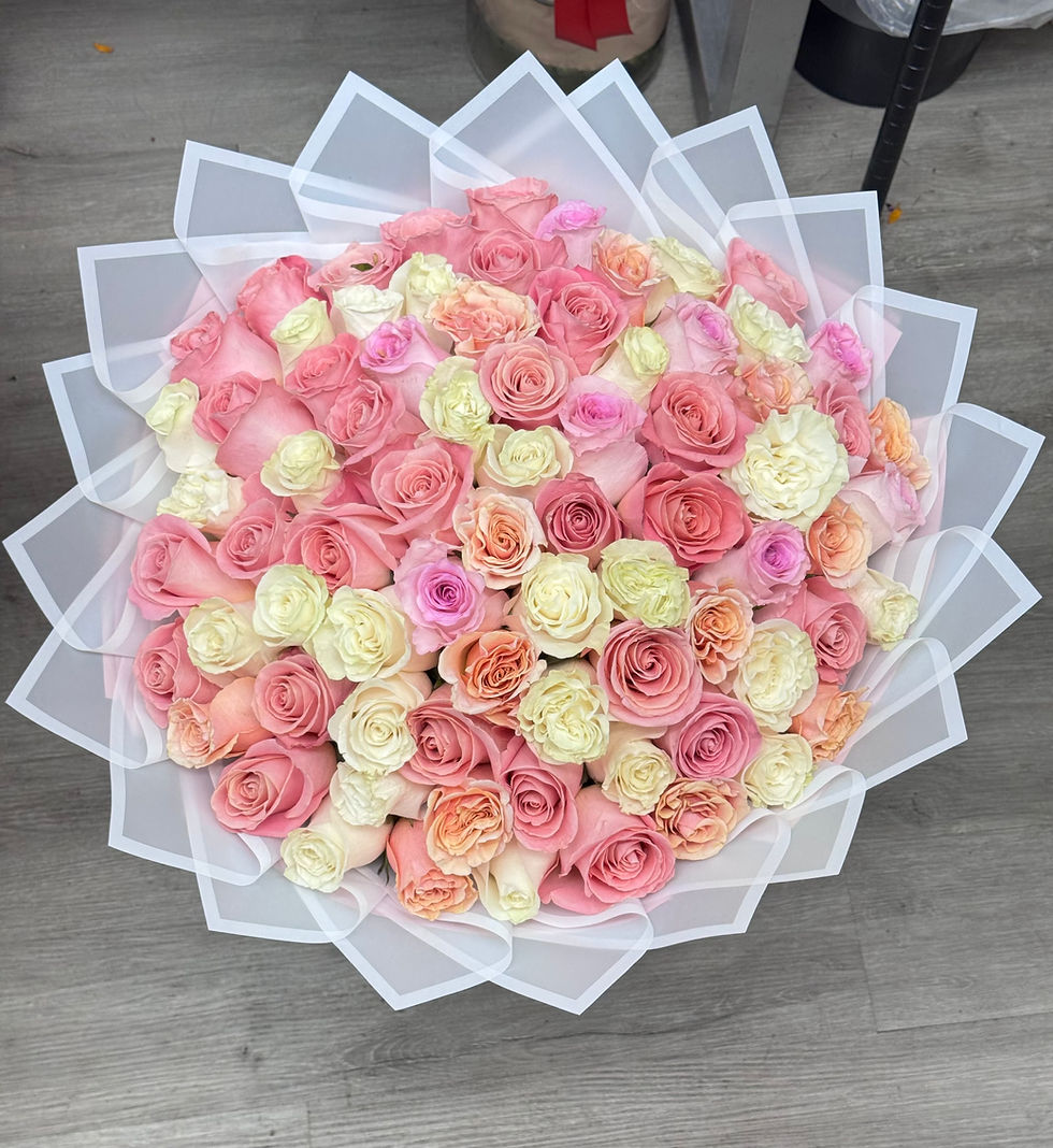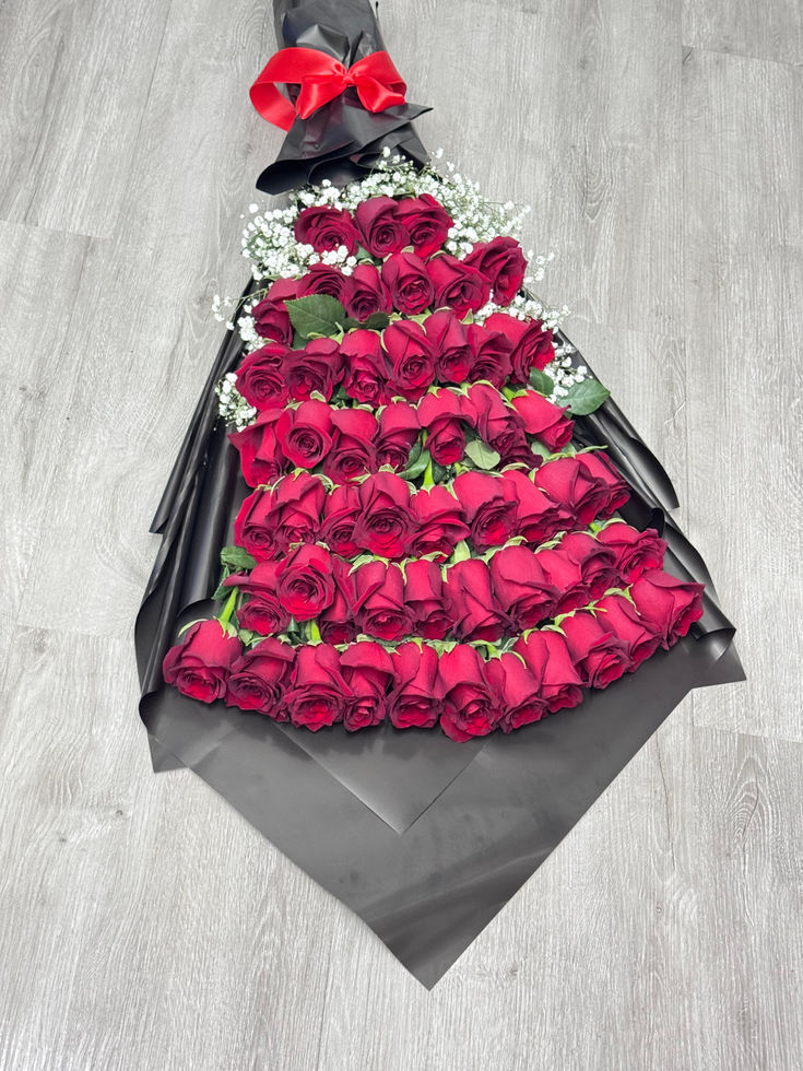 Beautiful long stem roses in black wax paper with baby breath stacked from small to long stems